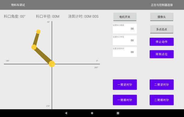 • 借助APP可實時監(jiān)測各臂架回轉(zhuǎn)角度、澆筑半徑、巡點進(jìn)度、電磁閥狀態(tài)及系統(tǒng)報警信息,并實時查看出料口視頻影像,全程可視、可控。