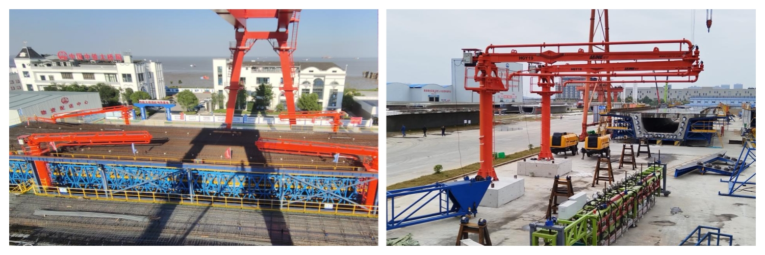 “建研”智能布料機(jī)已廣泛應(yīng)用于橋梁建設(shè)的多個關(guān)鍵環(huán)節(jié),包括錨碇、承臺、預(yù)制箱梁、橋面及橋塔等部位的混凝土澆筑。