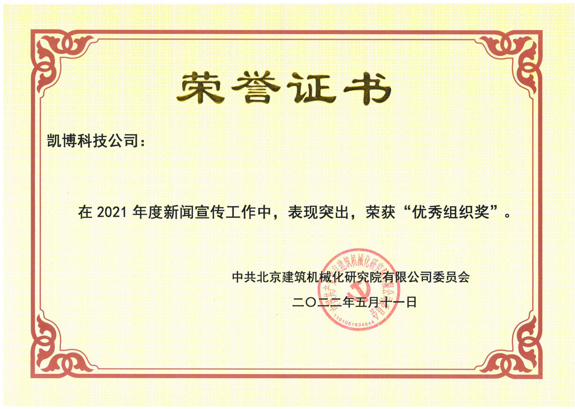 近日,廊坊凱博建設機械科技有限公司(以下簡稱“凱博科技”)榮獲北京建筑機械化研究院有限公司“新聞宣傳優(yōu)秀組織獎”。