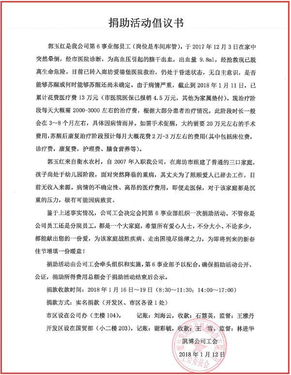 一方有難,八方支援。我公司第六事業(yè)部員工郭玉紅(崗位是車間庫(kù)管)于2017年12月3日在家中突然暈倒,經(jīng)市醫(yī)院診斷,為高血壓引起的腦干出血,經(jīng)搶救現(xiàn)已脫離生命危險(xiǎn),目前已轉(zhuǎn)入廊坊愛德堡醫(yī)院救治,仍處于昏迷狀態(tài),無(wú)自主意識(shí),是否能夠蘇醒或何時(shí)能夠蘇醒還無(wú)法判斷。郭玉紅來(lái)自衡水農(nóng)村,自2007年入職我公司,在廊坊市組建了普通的三口家庭,孩子尚處于幼兒園階段,面對(duì)突然降臨的重病,其丈夫?yàn)榱苏疹檺廴艘艳o去工作,目前無(wú)收入來(lái)源。不論經(jīng)濟(jì)層面還是精神層面,病情的不確定性、高昂的醫(yī)療費(fèi)用,對(duì)于該家庭都是極其沉重的壓力,極有可能因病致貧。